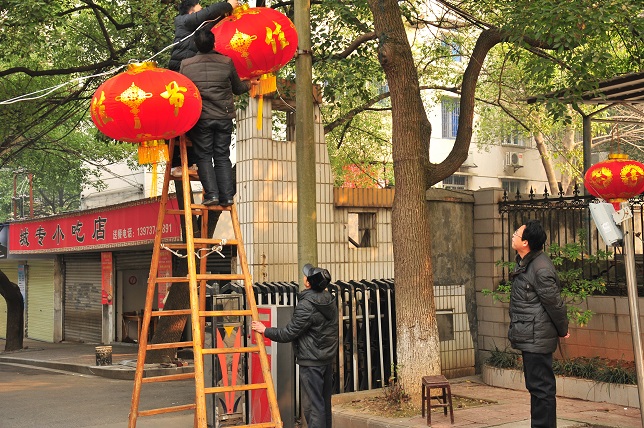 (本网讯)随着崭新的国旗、校旗在空中高高飘扬,大红灯笼高高挂起,霓虹彩条的耀眼闪烁,学校校园、家属区年味日渐浓厚。新春将至,为增添学校的喜庆气氛,党委宣传部更换了南大门的国旗、校旗,精心制作了大小不一的喜迎马年新春的横幅,选购了欢度春节的大红灯笼、霓虹彩条等,组织有关工作人员及时张挂、安放到校本部南、北两个大门,办公楼大门、体育训练馆大门、慧泽园家属区东、南门和朝阳校区前、后门等区域。为确保安放工作人员的安全,灯笼、横幅等张挂到位,宣传部陈国民部长全程参与指导了安放工作。