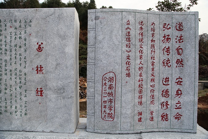 《道德经》文化石墙坐落于学校书城路、青城大道和玉壶山之间,由巨型大理石拼合组成,包括基座和墙体两部分,总长度35.6米,高度2.75米,上书《道德经》全文。引文为舒同体,简述建设缘由;正文由著名书法家贺京沙撰写,南岳知名石刻工艺师雕刻而成,是目前世界上最长的《道德经》石墙。