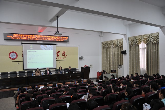 讲座由国际交流处处长周桂平主持。Paul Maguiness先生介绍了新西兰维特利亚理工学院的办学情况。迟美建女士介绍了新西兰的国情、教育、留学现状以及两校合作办学项目的优势 。