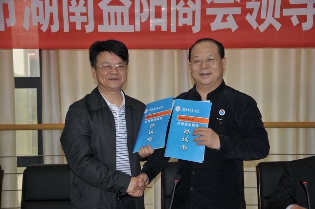 随后,汤放华代表学校与东莞市湖南益阳商会会长詹新签订了校企合作协议。