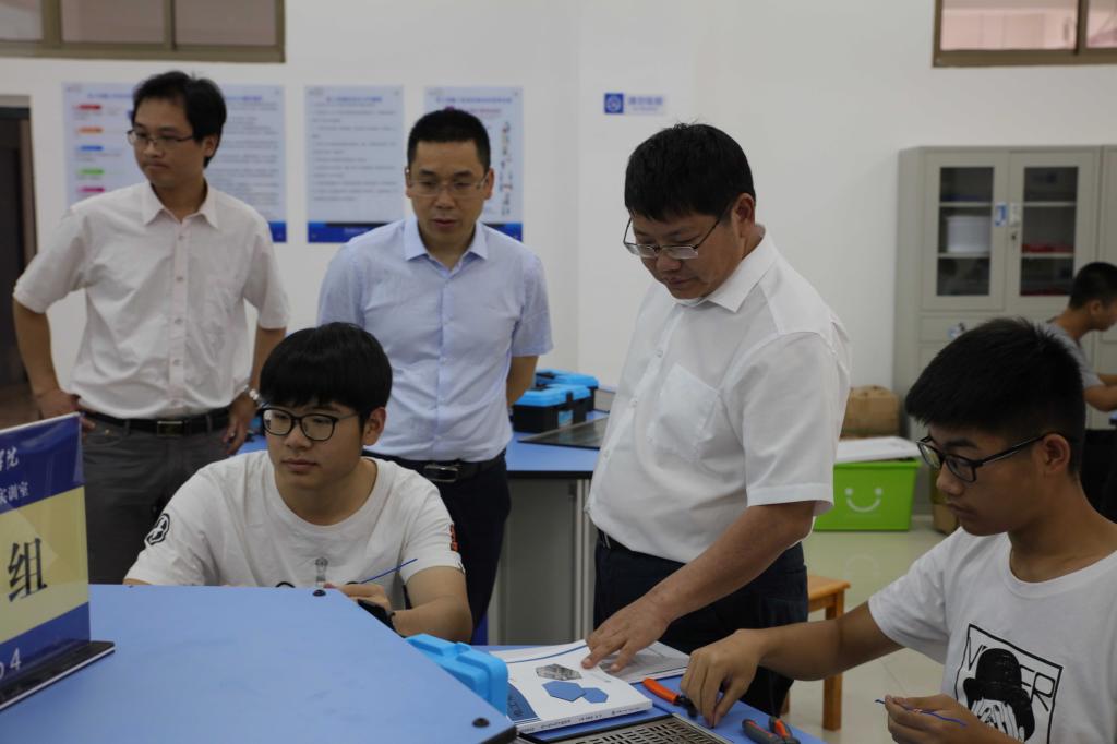 罗成翼在教务处、工程训练中心相关人员陪同下深入电工电子实训开课现场,随堂听取了李立雄和蔡振华两位老师指导的电工实训课程,了解了实训课老师的教学内容、教学方法、教学管理等情况。