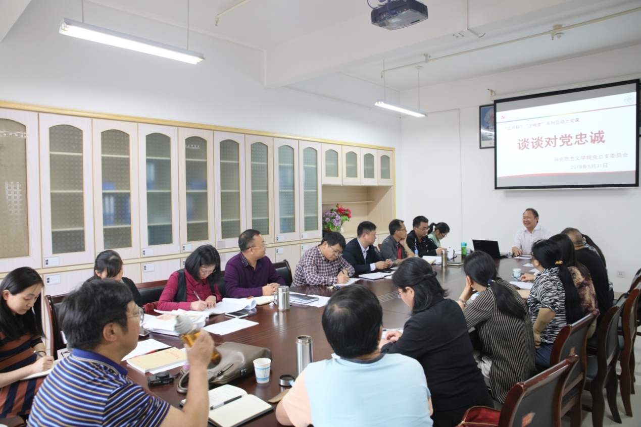 5月10日下午,马克思主义学院党总支下属两个教工党支部分别以主题党日活动形式进行学习讨论。全体党员结合自身实际,畅谈活动体会,对标入党誓词检查自己的政治忠诚。教工第一党支部党员出差在外的学校党委书记罗成翼通过微信语音作了发言。罗成翼强调,这次活动要联系学校的改革发展实际,特别是要联系我们当前的审核评估和“双一流”建设,要加强组织领导,要做细做实,要防止实用主义,要触及每个党员的灵魂。
