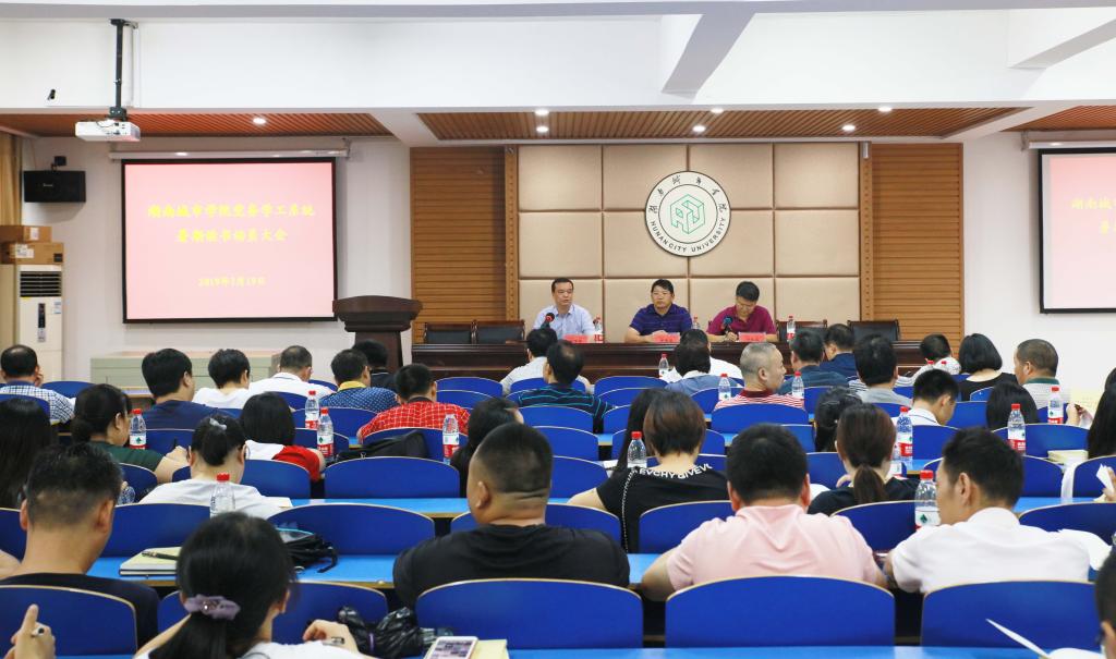 (本网讯)2019年7月19日,我校在二办公楼310召开了党务学工系统暑期读书动员大会。党委书记罗成翼、党委副书记汤放华、副校长雷存喜,党委委员李斌、袁志成出席会议,二级学院党委书记、副书记、辅导员,党政办、组织部、宣传部、学工部、招生就业处、团委全体人员以及教务处、科研处、马克思主义学院部分人员参加会议。会议由汤放华主持。