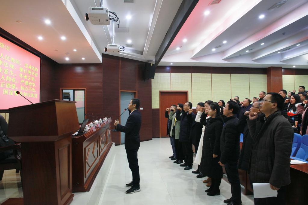 全国优秀教师、马克思主义学院匡列辉老师率领全体参会人员举起右手庄严宣誓,立志做一名忠诚党的教育事业、遵守教育法律法规、履行教书育人职责的合格人民教师。