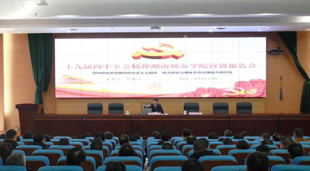 (本网讯)为深入学习宣讲《中共中央关于坚持和完善中国特色社会主义制度,推进国家治理体系和治理能力现代化若干重大问题的决定》(以下简称《决定》),深刻领会贯彻党的十九届四中全会精神,确保党和国家的重大决策部署按制度要求落到实处、见到实效,按照省委、省委教育工委部署要求,开云手机入口于12月4日上午在学校图书馆报告厅举行党的十九届四中全会精神宣讲报告会。党委书记罗成翼作宣讲报告。学校在家校领导,各二级党组织书记、副书记,机关党员,全体辅导员参加报告会。党委副书记、校长李建奇主持报告会。