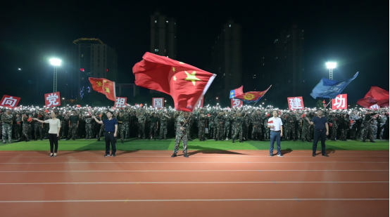 新生们列队整齐,个个精神抖擞,朝气蓬勃。皓月星空之下,师生们齐唱红色歌曲,用手机舞动闪光灯,用满腔的爱国热情向祖国表白,现场气氛热烈,嘹亮的歌声响彻整个田径场。