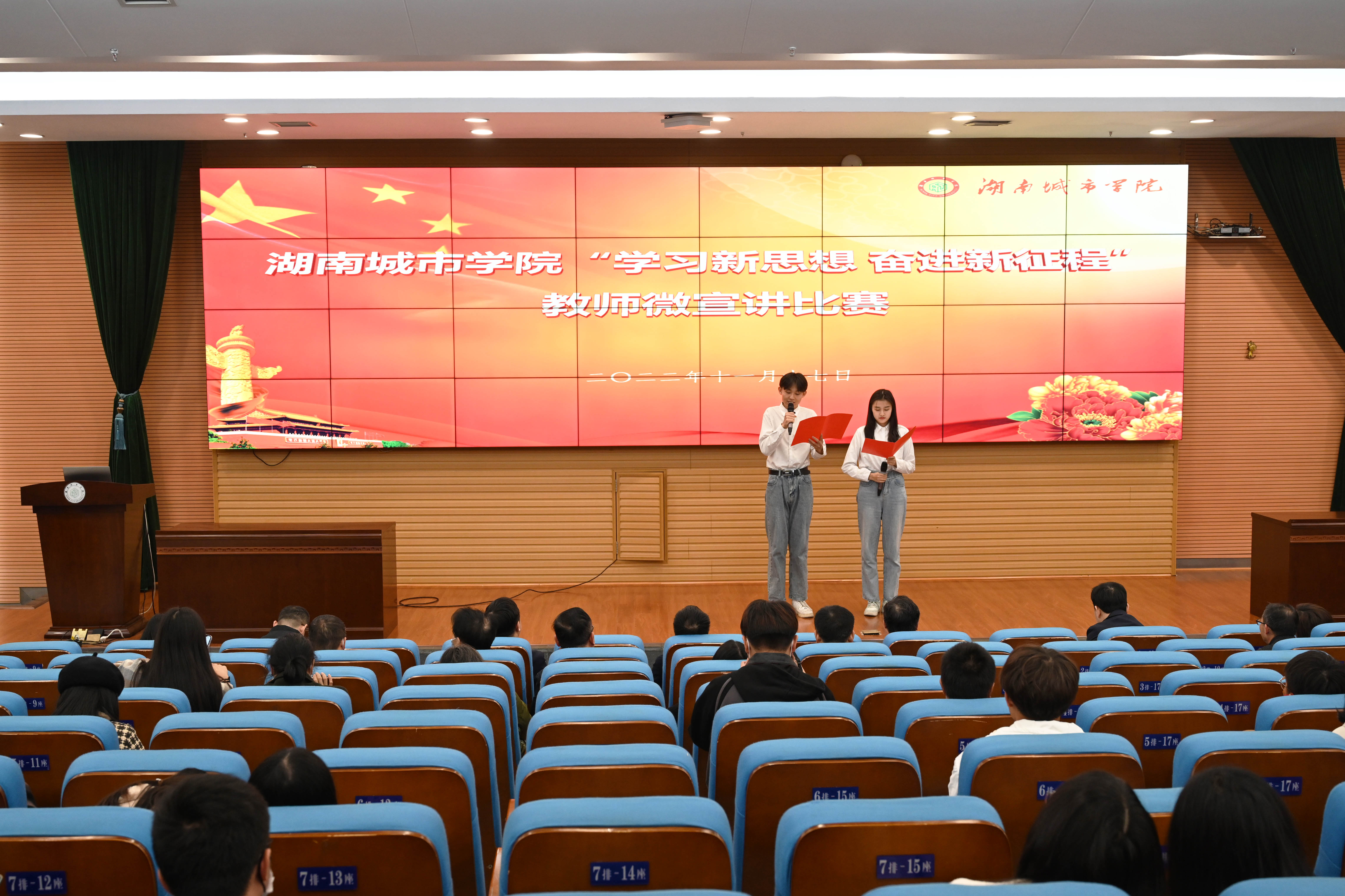 本网讯(通讯员 周文娟)“党的二十大开启了以中国式现代化全面推进中华民族伟大复兴的新征程,中国式的现代化需要现代化的人才做支撑……” 11月17日,开云手机入口“学习新思想,奋进新征程”教师微宣讲比赛在图书馆报告厅举行。来自各二级单位的18位参赛选手们围绕党的二十大报告,从党的二十大的历史地位与重大意义、党的二十大精神等方面,用“小故事”诠释“大道理”,将党的创新理论送到师生的心坎上。党委副书记何旭娟,副校长袁志成,党委委员、组织部部长吕贤军出席。