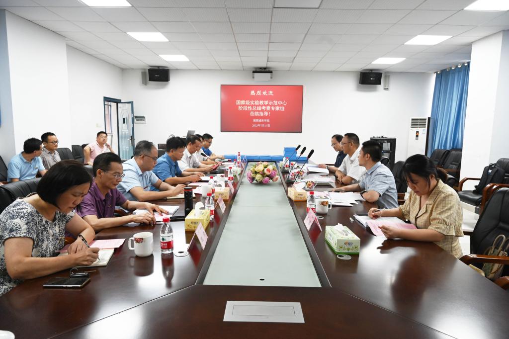 汤放华对专家组莅临我校检查、指导工作表示欢迎,对省教育厅、各位专家对我校建设和发展给予的支持和帮助表示感谢,他就我校的办学历史、办学特色以及土木工程国家级实验教学示范中心近年来的建设情况作了简要介绍。中心主任黎永索从管理与运行机制、教学与人才培养、教学改革与研究、示范引领成效等七个方面对中心2018-2022年的阶段性建设工作进行了汇报。