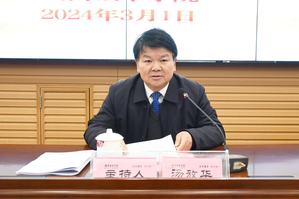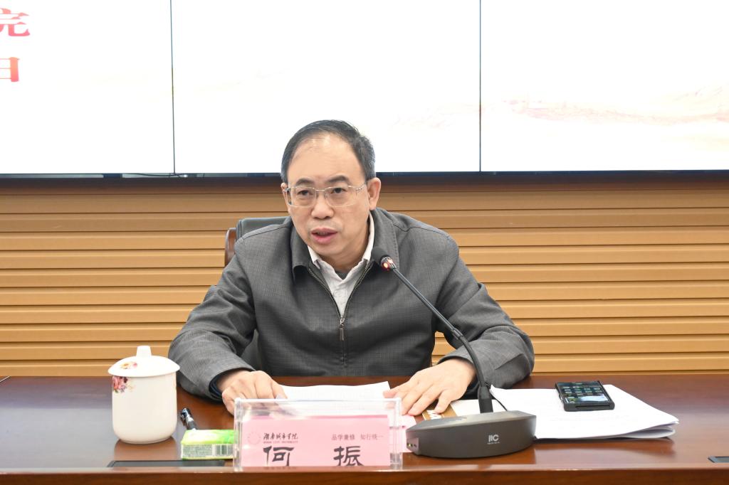 校长何振介绍了寒假工作开展情况、新学期开学工作部署以及2024年重点工作。他指出,今年寒假期间,不少部门的同志克服雨雪冰冻天气的不利因素,坚守岗位、加班加点,做了大量富有成效的工作:硕士点申报高效完成、校地合作不断深化、科研项目申报组织有序、“校友回湘”工作扎实推进、后勤保障坚实有力。