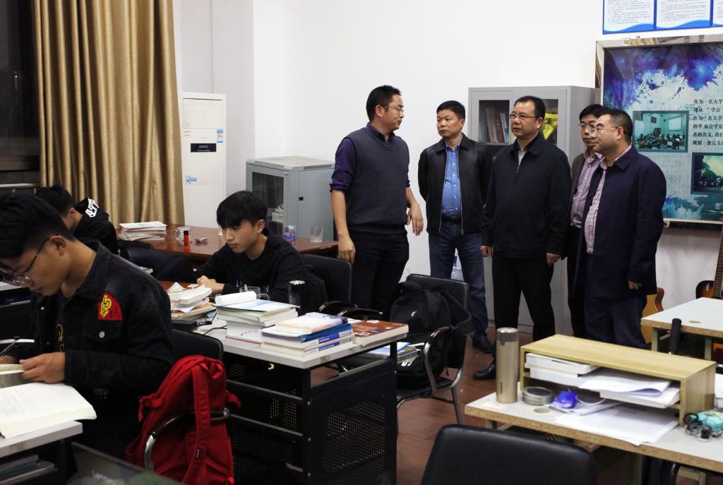 (本网讯)为进一步做好审核评估冲刺阶段的工作,2018年10月23日晚,校长李建奇,副校长郑卫民、雷存喜、谭献良深入教学楼栋、学生宿舍等地,检查指导本科教学工作审核评估各项准备工作。宣传部、教务处、学生工作处、基建与后勤管理处等部门负责人以及各二级学院党委(党总支)副书记陪同检查。