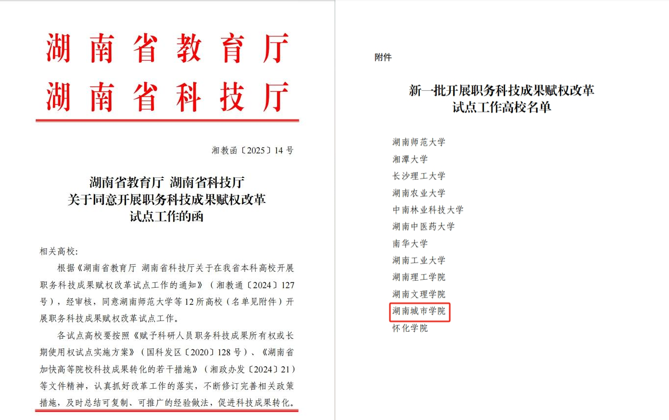 本网讯(通讯员 刘湛军)近日,湖南省教育厅、科学技术厅联合发布《关于同意开展职务科技成果赋权改革试点工作的函》,我校获批为开展职务科技成果赋权改革试点单位。