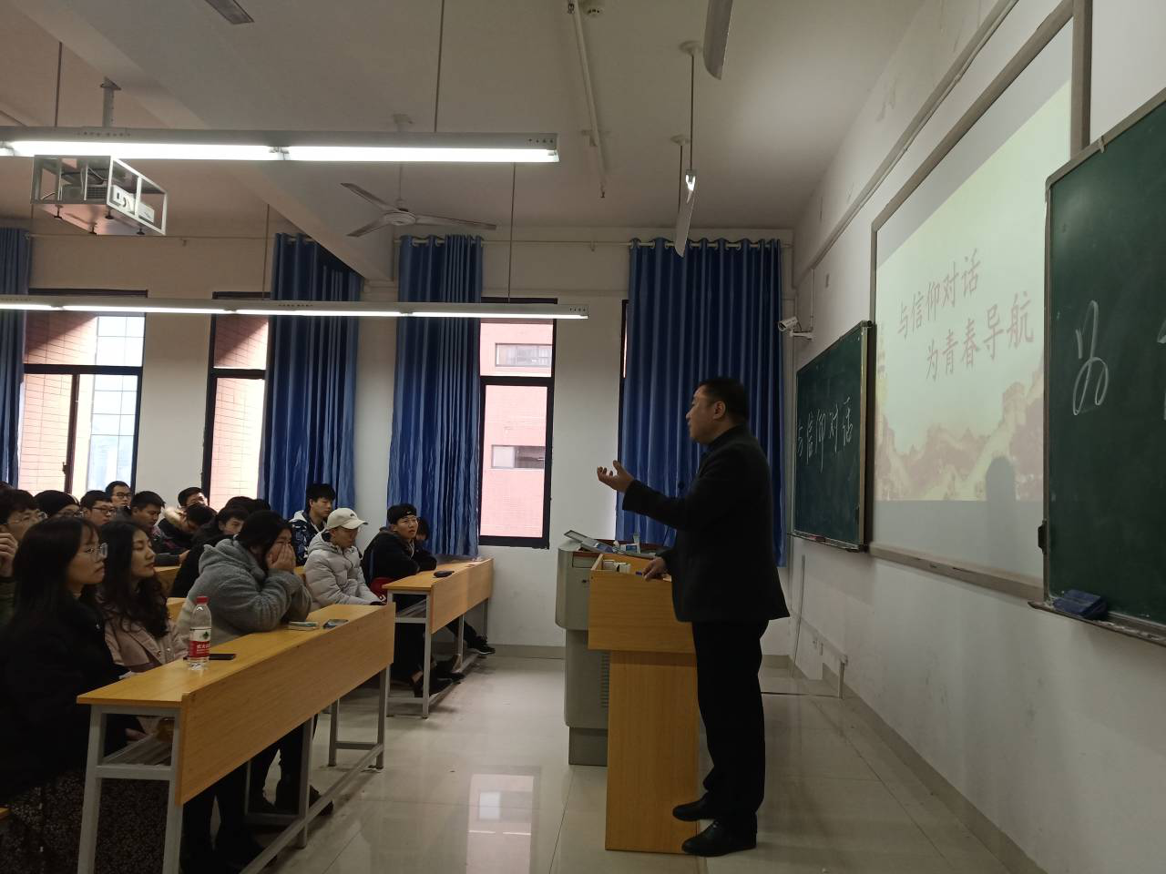 阳同光院长还与同学们进行了深度交流,回答了学生提出的“我们当代大学生要如何把握习近平新时代中国特色社会主义思想中的新思想?新思想新在什么地方,何为新?新思想怎么落实到具体行动中?”等一系列问题,座谈气氛活跃,同学们提问、发言积极,承青春力量,与信仰对话,为青春导航,同学们表示将坚定信仰,不负青春韶华,创造精彩未来。