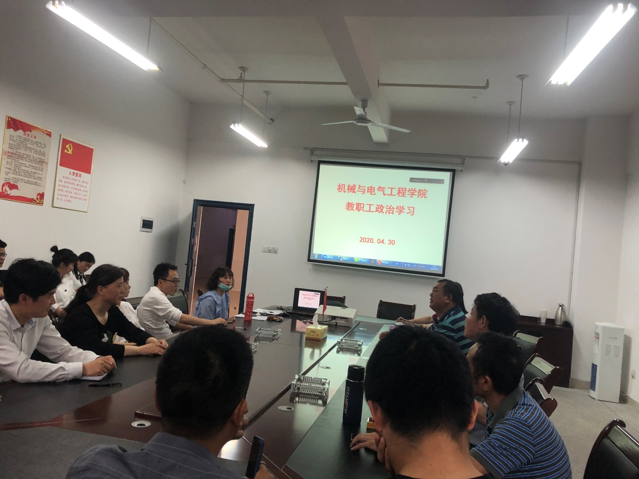 进一步贯彻传达开云手机入口四届五次教职工、工会会员代表大会成果和精神,2020年4月30日下午,机械与电气工程学院在会议室召开了全院教职工政治学习。由于疫情的影响,本次政治学习采取现场学习与线上会议相结合的形式举行,会议由党总支书记徐畅贤主持。