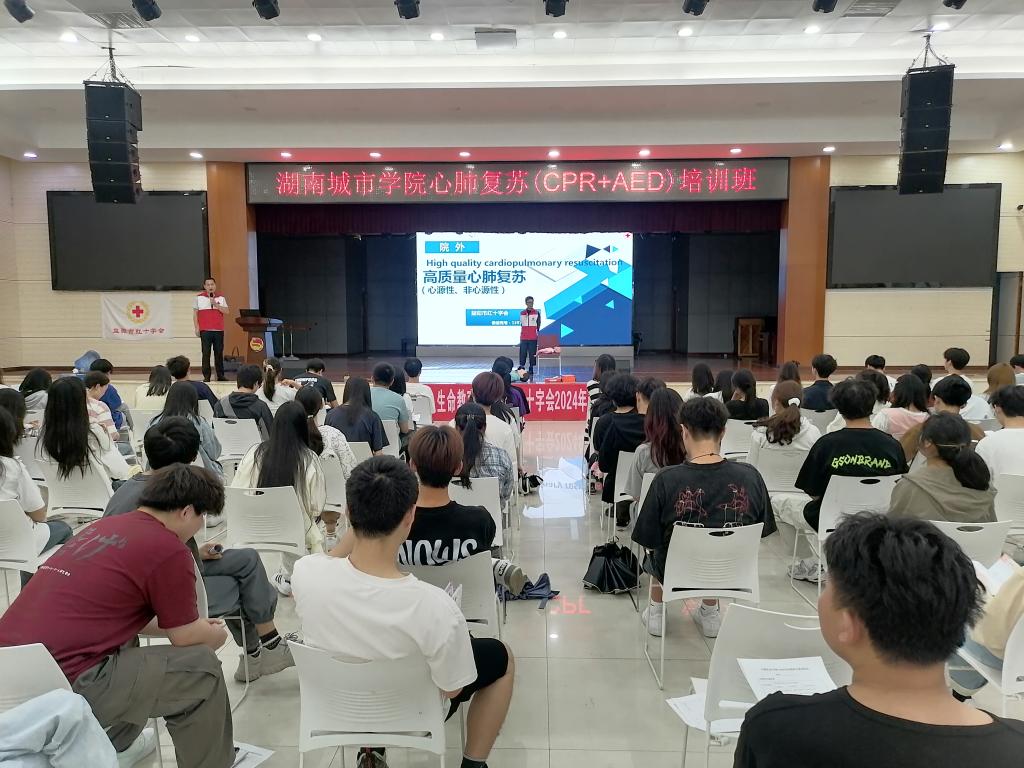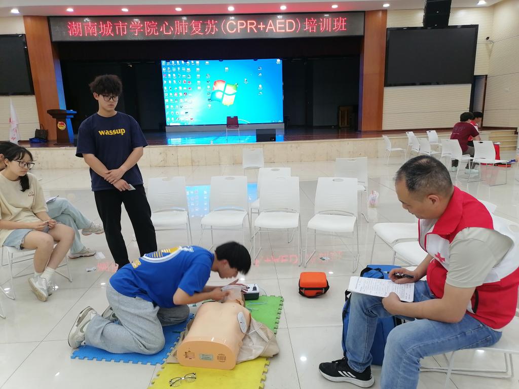 (撰稿 杨新成)为进一步提高我校师生的基本救护技能,提升全校师生应对突发事件和意外伤害事故的自救互救能力,保障师生健康和生命安全,5月30日,由我校后勤管理处主办,益阳市红十字会承办的“救在身边,生命教育——2024年心肺复苏(CPR+AED)培训班”在我校学生活动中心开班,130名大学生参加培训。