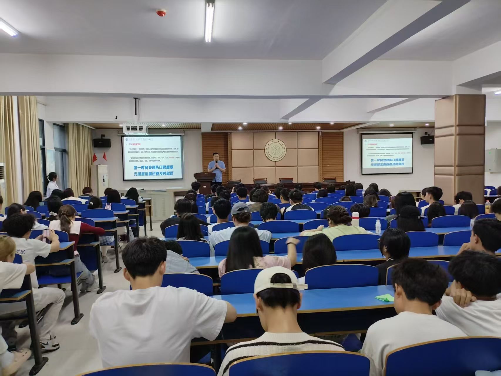本次宣教活动邀请了益阳医专附属医院急诊科专家指导和宣讲,通过讲座、展台、展板、横幅等多种形式开展了宣传教育。益阳医专附属医院急诊科副主任朱坚老师为师生们上了通俗易懂的一课,他以“犬咬伤的现场处理及预防”为题,从狂犬病的流行病学、犬猫咬伤的急救处理、狂犬病的防控措施、常见问题解答等几方面深入浅出地作了讲解。同时,他特别强调了“狂犬病可防不可治,致死率几乎为100%”“犬咬伤后,第一时间处理伤口很重要,无明显出血也要及时就医”“被犬咬猫抓伤后,一定要进行规范狂犬病暴露后处置,尽早接种狂犬病疫苗,注射狂犬病免疫球蛋白或抗狂犬病血清进行预防,及时接种破伤风疫苗也尤为重要”“被接种过狂犬病疫苗的犬/猫咬伤或抓伤后,仍需要规范接种狂犬病疫苗”等几个模糊且容易忽视但非常重要的实际问题。在互动环节,师生们踊跃参与,进一步加深了狂犬病防控知识的了解,增强了健康安全防护意识。