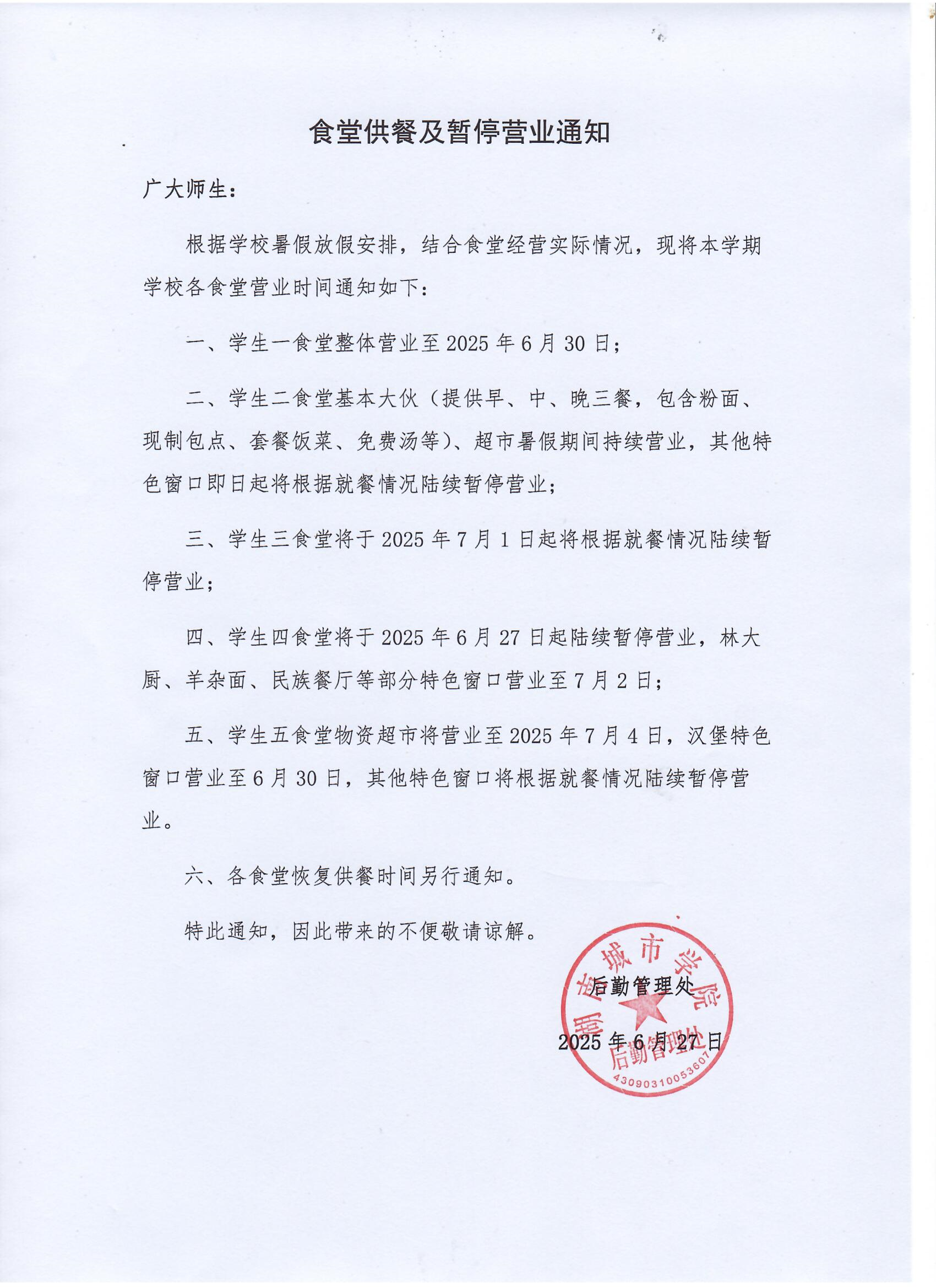 食堂供餐及暂停营业通知