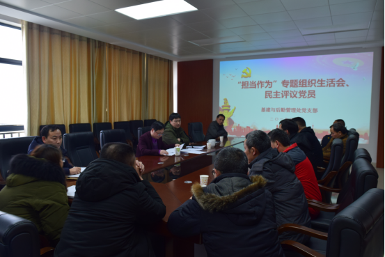 根据校党委组织部《关于召开“担当作为”专题组织生活会、开展民主评议党员工作的通知》要求,基建与后勤管理处党支部结合工作实际,于2019年1月17日下午召开了以““担当作为”为主题的专题组织生活会和民主评议党员。机关总支刘政科同志到会指导,支部全体党员参加会议。