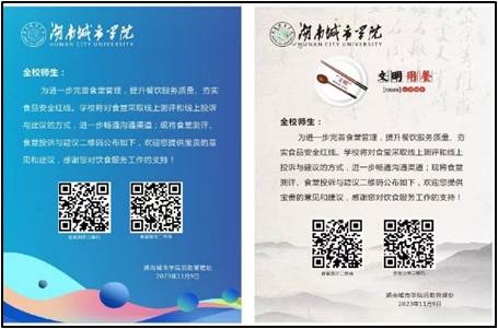 后勤管理处通过“问卷星”信息化平台,开通了投诉建议与食堂线上测评通道,并在各个食堂门口、大厅等显眼位置张贴了“二维码”,欢迎师生通过“扫码”的方式对食堂开展测评和进行投诉和意见反馈。