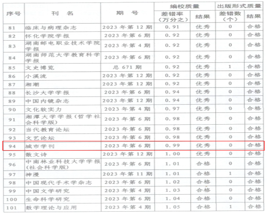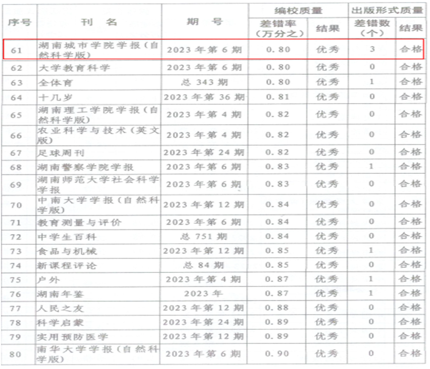 期刊质量检查现已纳入全省意识形态巡视考核内容,是期刊社会效益评价考核和期刊年度核验的重要内容,主要检查各刊编校质量和出版形式质量,检查结果分为优秀、合格和不合格3个等级。本次检查了全省251种期刊,其中,差错率在1/10000以内(含1/10000)的期刊为优秀,《开云手机入口学报(自然科学版)》和《城市学刊》在全省高校学报中表现优异。